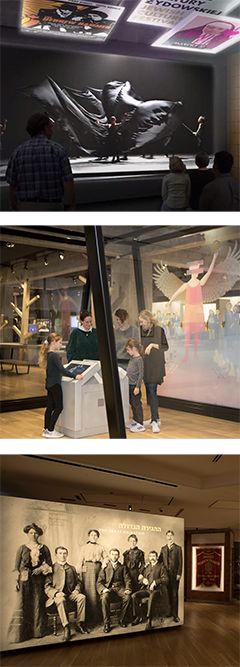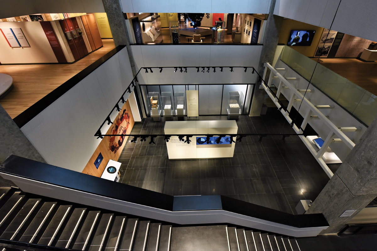and displays throughout the three floors of the museum.